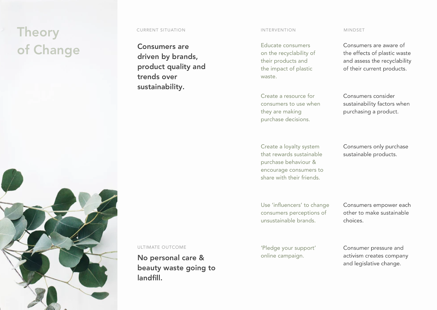 To be able to design effectively for the short term it is important to know what the desired overall outcome is. For this, we created a theory of change with multiple steps. Our vision is for all packaging in this industry to be part of a closed loop system. Our solution has two parts, harnessing consumer power to create industry change and educating consumers on how to dispose of packaging correctly.