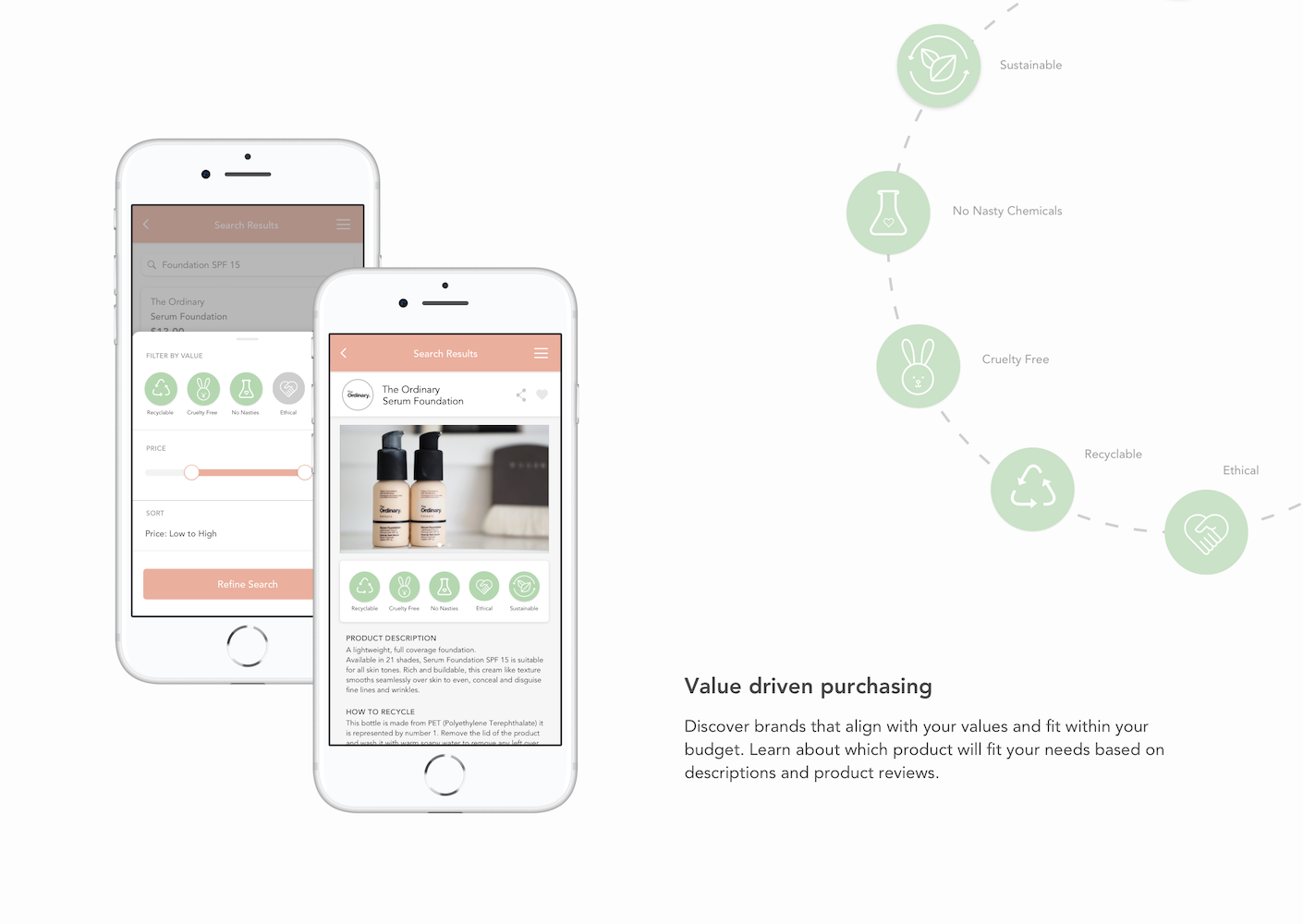 Within our app, we have created a rating system based on existing global accreditations that consumers know and trust to build legitimacy through the app. There will be five sections in which companies will be assessed. Users can filter with these values when searching with the app to find products that fit their values.
