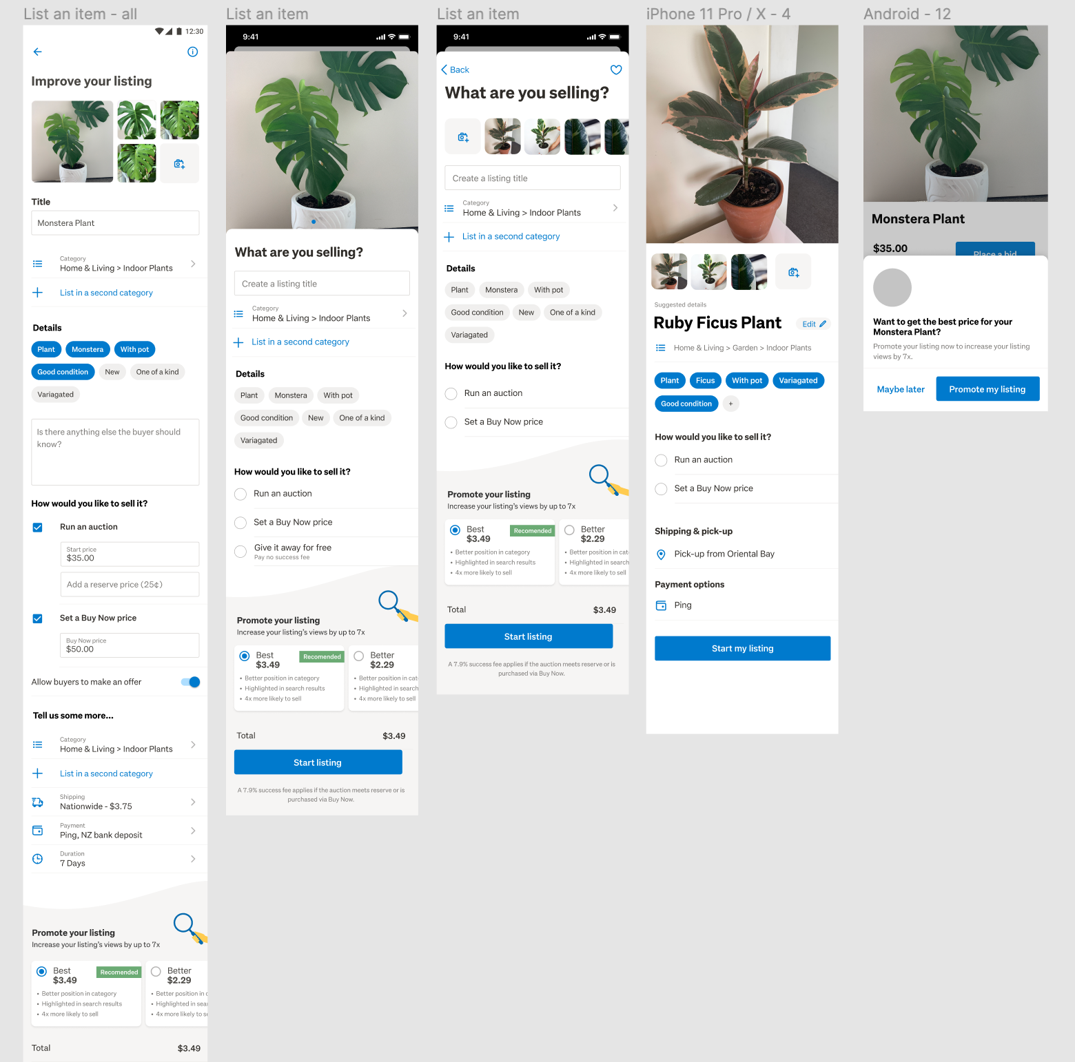 I led usability testing with a range of participants. The goals of testing were to understand users’ perception of the speed and simplicity of the new sell process. I also looked to understand the impact of removing previous fields on users, explore what future ideas are likely to be desirable features. I also looked at how users might re-engage with promotions through post-listing experiences.