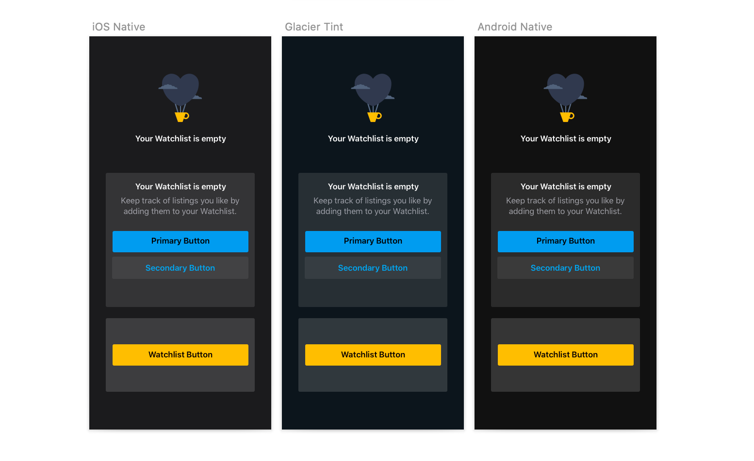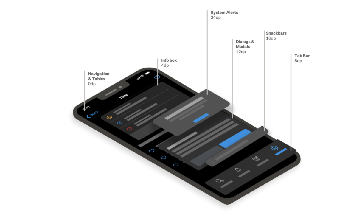 Elevation is core to hierarchy within dark mode as it enables different UI elements to standout to the user without the use of shadows. I decided to use system-defined semantics to future proof for any potential changes from Apple and avoid clashes in the instances where native components are used within the app such as system dialogs.